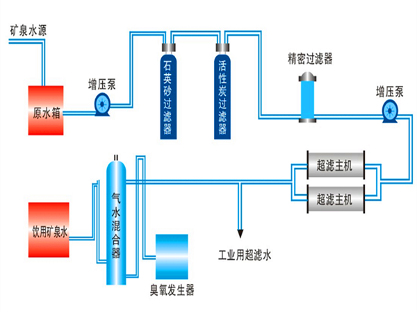 原水箱→原水增壓泵→機(jī)械過(guò)濾器→活性炭過(guò)濾器→1μm精濾→超濾主機(jī)→臭氧消毒→凈水箱→灌裝→成品