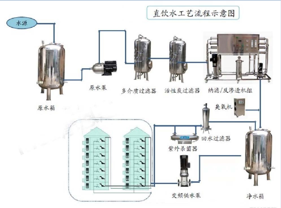 直飲水設(shè)備系統(tǒng)概述:直飲水系統(tǒng)是由原水箱、增壓單元、預(yù)處理單元、膜主機單元、循環(huán)供水單元、消毒單元、自動控制單元、專用管網(wǎng)、專用水表、各式飲水終端等組成。